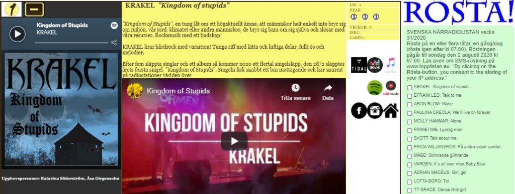 KRAKEL toppar Svenska närradiolistan även denna gång med ”Kingdom of Stupids”. Tack för alla röster. Rösta här!